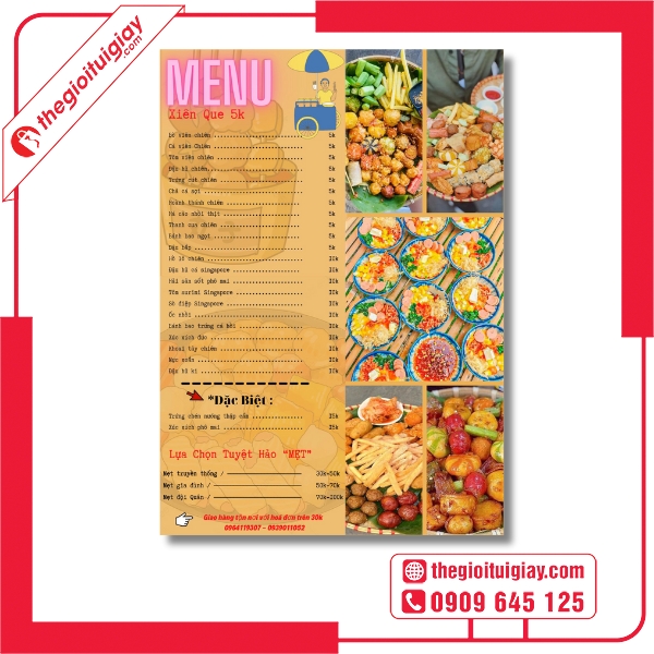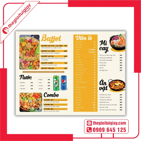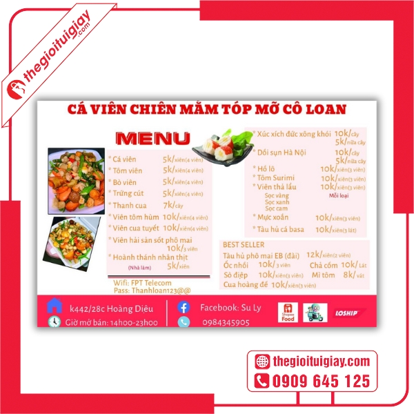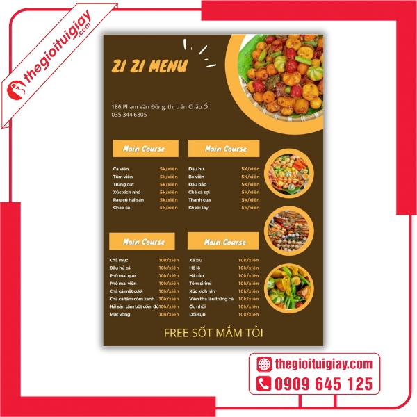 Nếu bạn đang tìm kiếm menu cá viên chiên đẹp, bền, thu hút khách – hãy đến ngay Thế Giới Túi Giấy. Dịch vụ thiết kế – in ấn chuyên nghiệp, giá tốt và giao hàng toàn quốc sẽ giúp bạn sở hữu bộ menu hoàn hảo cho quán. Liên hệ hotline: 0909.645.125 để được tư vấn và nhận báo giá nhanh nhất!