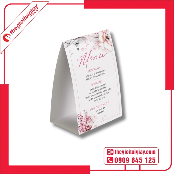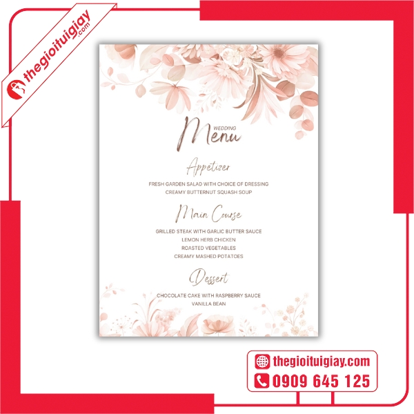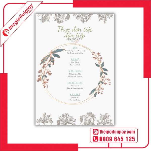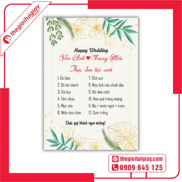 Với dịch vụ của Thế Giới Túi Giấy, bạn sẽ sở hữu menu đám cưới tinh tế, chuyên nghiệp, giúp buổi tiệc thêm hoàn hảo và ghi dấu ấn khó quên. Liên hệ ngay hotline 0909.645.125 để được tư vấn và thiết kế menu theo phong cách riêng của bạn.