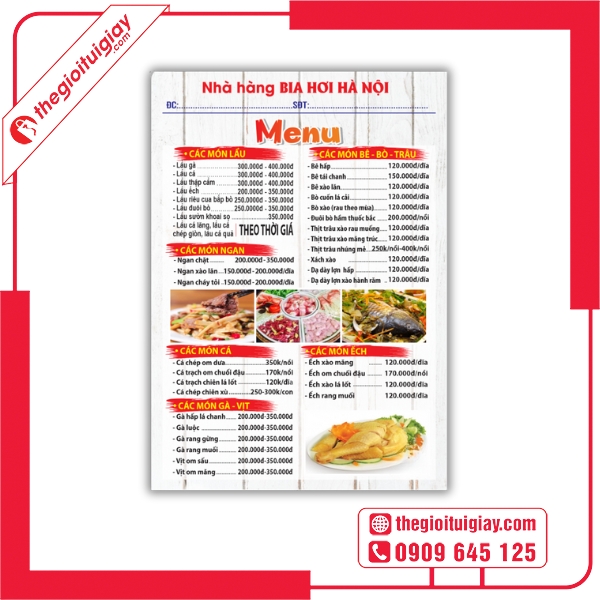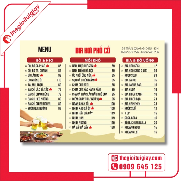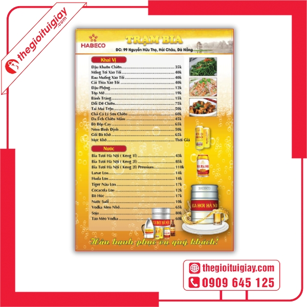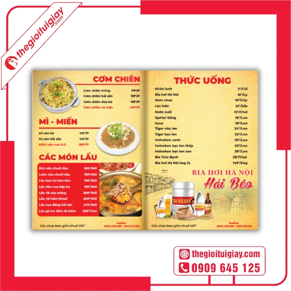 Một menu quán bia hơi đẹp và chuẩn thương hiệu chính là yếu tố giúp quán của bạn khẳng định phong cách và tạo dấu ấn riêng trong lòng khách hàng. Nếu bạn đang tìm kiếm địa chỉ thiết kế và in menu quán bia hơi uy tín, hãy liên hệ ngay Thế Giới Túi Giấy qua hotline 0909.645.125 để được tư vấn miễn phí và nhận những mẫu menu ấn tượng, chất lượng nhất!