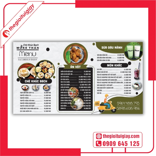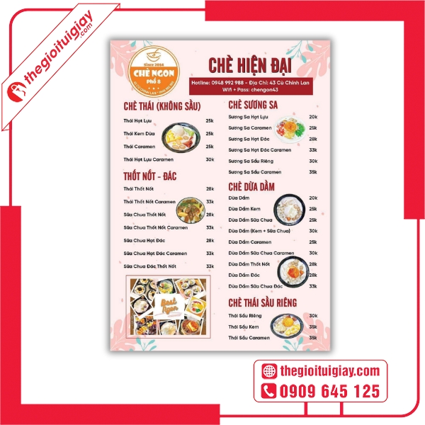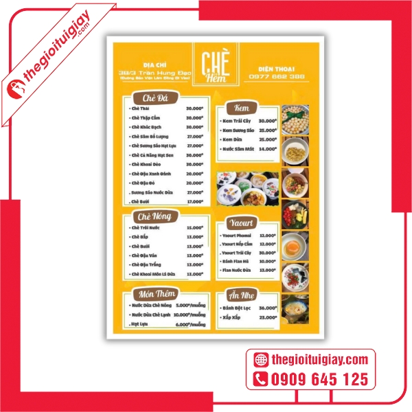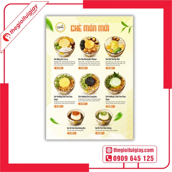 Một menu quán chè đẹp, rõ ràng và đồng nhất với thương hiệu chính là vũ khí giúp quán bạn ghi điểm trong mắt khách hàng. Nếu bạn đang cần thiết kế hoặc in menu quán chè giá rẻ, chất lượng cao, hãy liên hệ ngay với Thế Giới Túi Giấy qua hotline 0909.645.125 để được tư vấn miễn phí và nhận báo giá tốt nhất hôm nay!