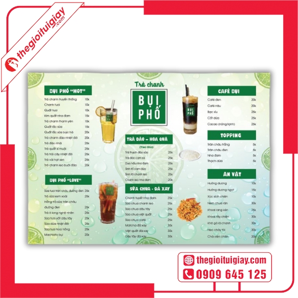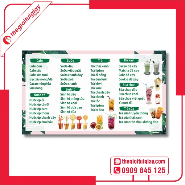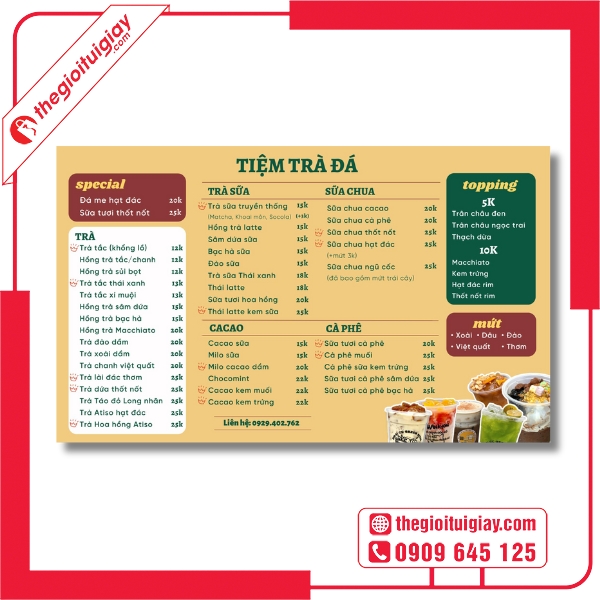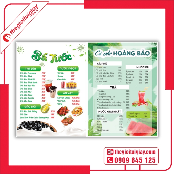 Nếu bạn đang tìm kiếm một đơn vị thiết kế và in menu quán trà đá uy tín, Thế Giới Túi Giấy chính là lựa chọn đáng tin cậy. Với đội ngũ thiết kế sáng tạo, công nghệ in tiên tiến và quy trình làm việc chuyên nghiệp, chúng tôi cam kết mang đến cho bạn những mẫu menu chất lượng, giúp quán thu hút khách hàng và nâng tầm thương hiệu. Liên hệ ngay hotline: 0909.645.125 để được tư vấn và nhận báo giá nhanh nhất!