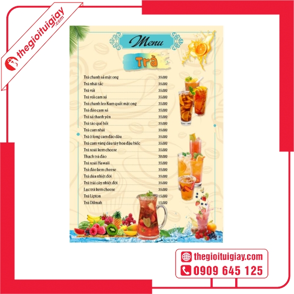 Menu quán trà đá không chỉ là bảng thông tin đồ uống mà còn là yếu tố giúp quán tạo ấn tượng đầu tiên với khách hàng. Một thiết kế menu rõ ràng, bắt mắt và mang dấu ấn riêng sẽ góp phần nâng cao trải nghiệm, đồng thời thể hiện sự chuyên nghiệp của chủ quán. Tại Thế Giới Túi Giấy, chúng tôi mang đến giải pháp thiết kế và in menu quán trà đá đẹp, bền và phù hợp với mọi phong cách – từ bình dân đến hiện đại.