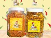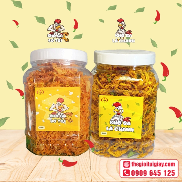 Mẫu tem ăn vặt vuông 5x5cm in logo khô gà lá chanh nổi bật
