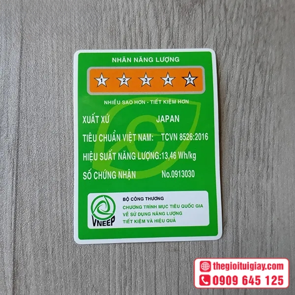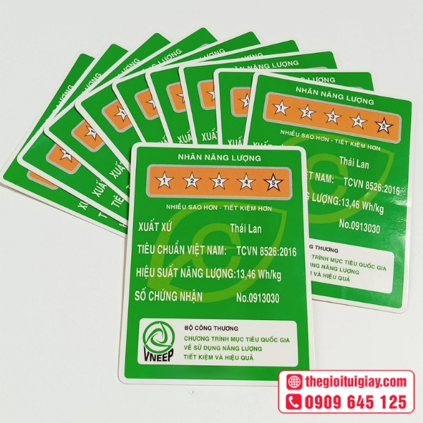 Trong bối cảnh người tiêu dùng ngày càng quan tâm đến việc tiết kiệm điện năng, tem năng lượng đã trở thành công cụ quan trọng giúp nhận diện và so sánh hiệu suất sản phẩm. Tại Thế Giới Túi Giấy, chúng tôi mang đến dịch vụ thiết kế và in ấn tem năng lượng sắc nét, bền đẹp, đa dạng mẫu mã, giúp sản phẩm nổi bật hơn trên thị trường và tạo niềm tin vững chắc đối với khách hàng.