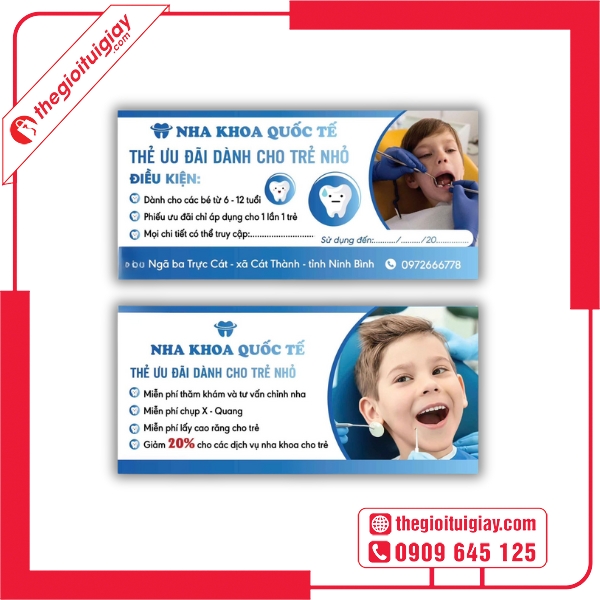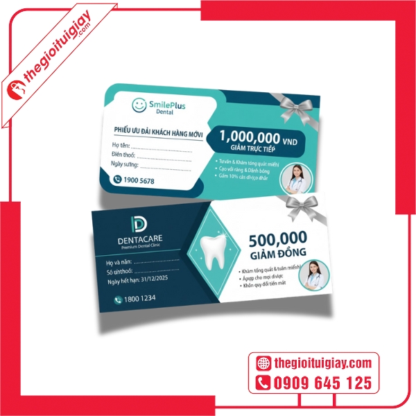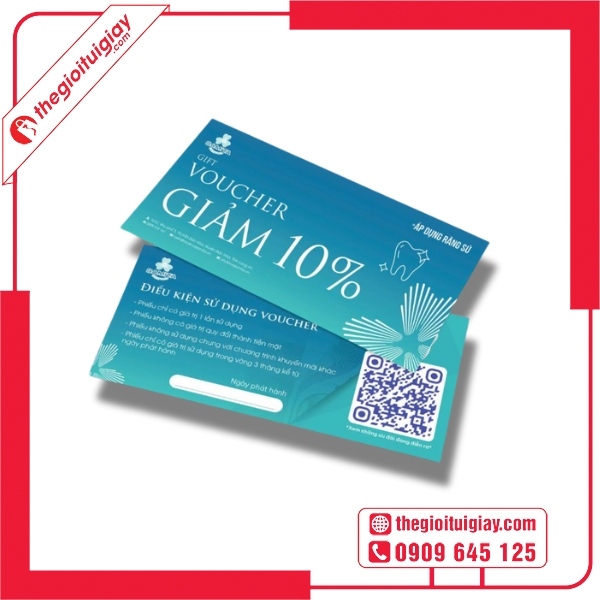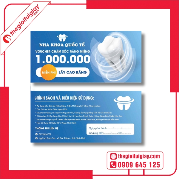 Đầu tư vào thiết kế và in voucher nha khoa tại Thế Giới Túi Giấy chính là bước đi thông minh giúp phòng khám bạn nâng tầm thương hiệu và thu hút khách hàng hiệu quả. Liên hệ ngay hotline 0909.645.125 để được tư vấn và phục vụ tốt nhất.