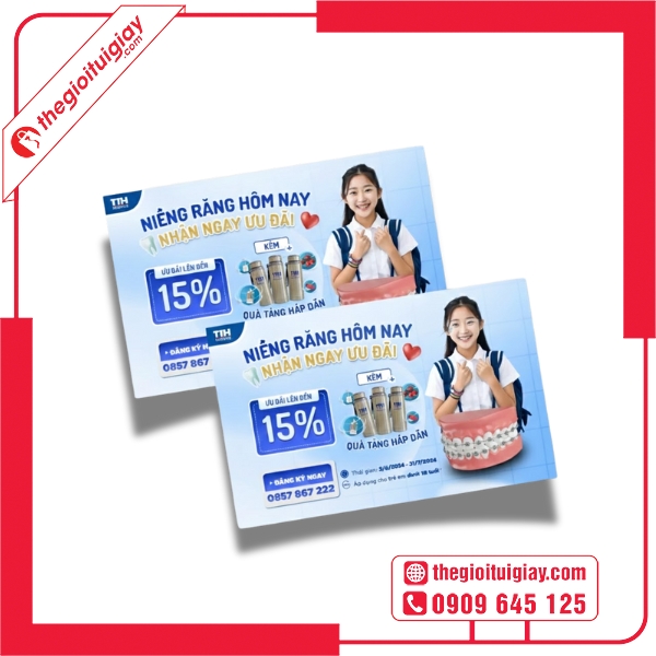 Voucher niềng răng đang trở thành công cụ ưu đãi phổ biến tại các phòng khám nha khoa, giúp thu hút khách hàng mới và tăng tỷ lệ chuyển đổi dịch vụ. Với sự chuyên nghiệp trong thiết kế và cách trình bày, voucher không chỉ mang tính khuyến mãi mà còn thể hiện uy tín của thương hiệu. Nếu bạn đang tìm nơi thiết kế – in ấn chuẩn thẩm mỹ ngành nha, Thế Giới Túi Giấy là lựa chọn phù hợp. Tại đây, bạn sẽ được hỗ trợ từ ý tưởng đến sản phẩm cuối cùng một cách nhanh chóng và hiệu quả.