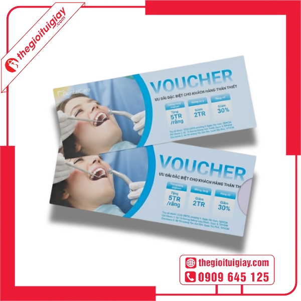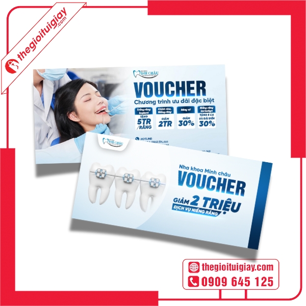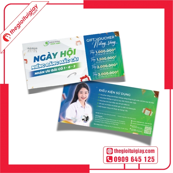 Voucher niềng răng là công cụ marketing mạnh mẽ, giúp nha khoa gia tăng niềm tin và thu hút khách hàng ngay từ ấn phẩm đầu tiên. Thế Giới Túi Giấy cam kết mang đến sản phẩm chất lượng cao, thiết kế chuẩn ngành và dịch vụ chuyên nghiệp. Liên hệ ngay 0909.645.125 để được tư vấn và nhận báo giá in voucher nhanh chóng nhất.